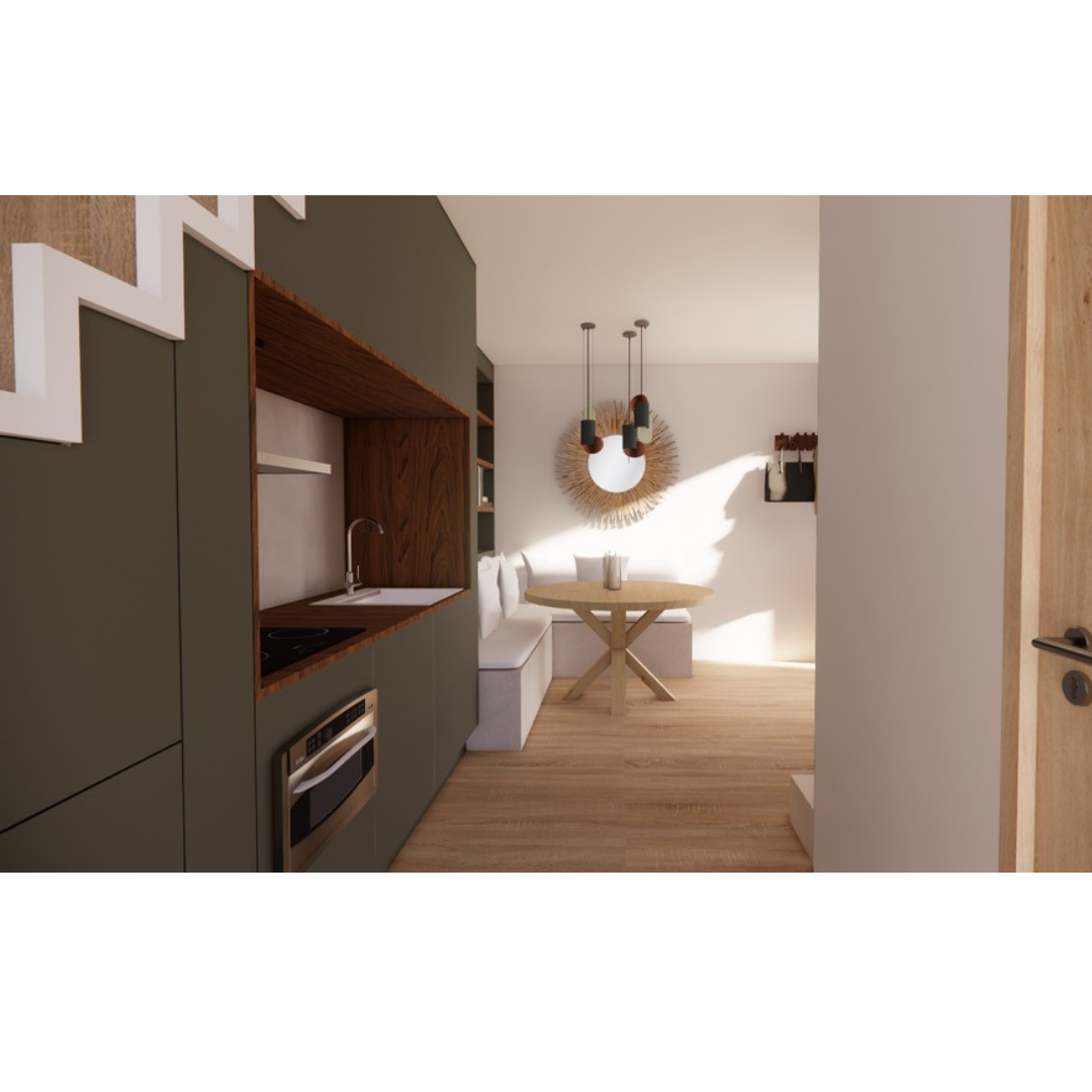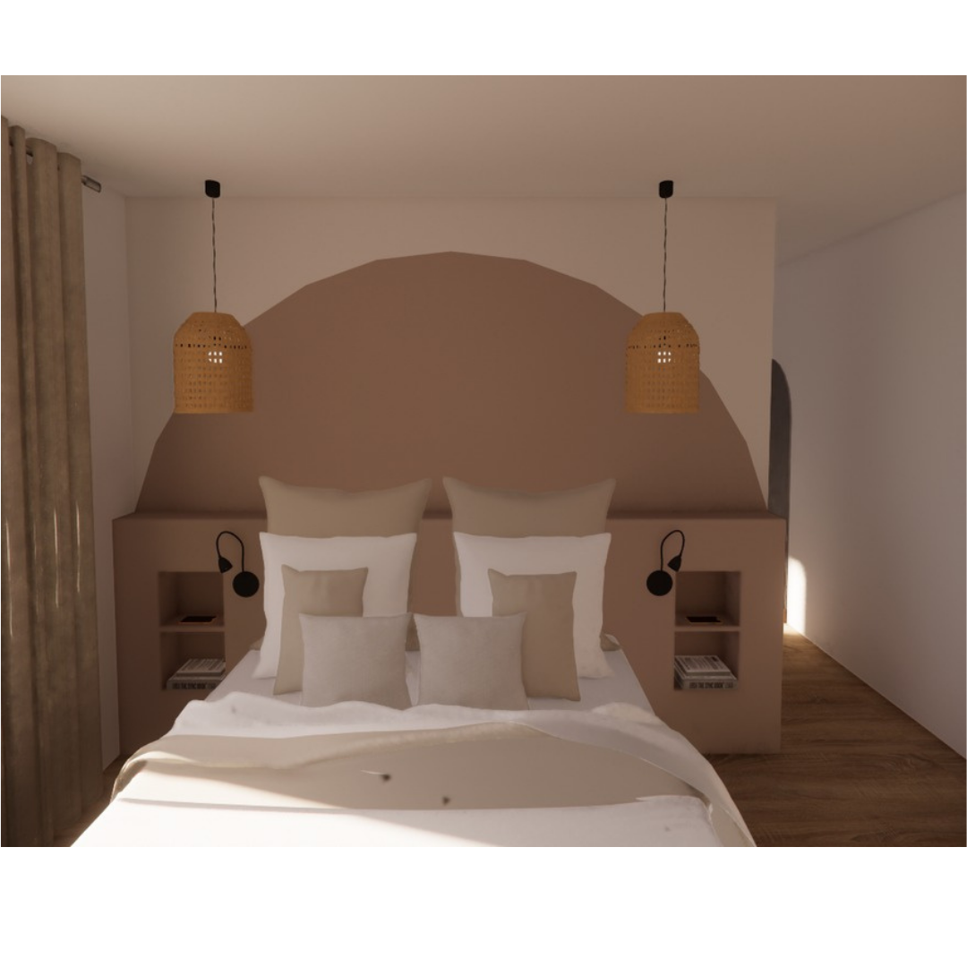 Les espaces nuit et pièces d’eau adoptent une écriture plus douce et minérale, mêlant micro-ciment, bois naturel et mobilier intégré dans une recherche d’équilibre entre confort, durabilité et intemporalité. Une attention particulière est portée aux aménagements sur mesure, notamment dans la chambre d’enfant conçue comme un espace évolutif capable d’accompagner les usages dans le temps.