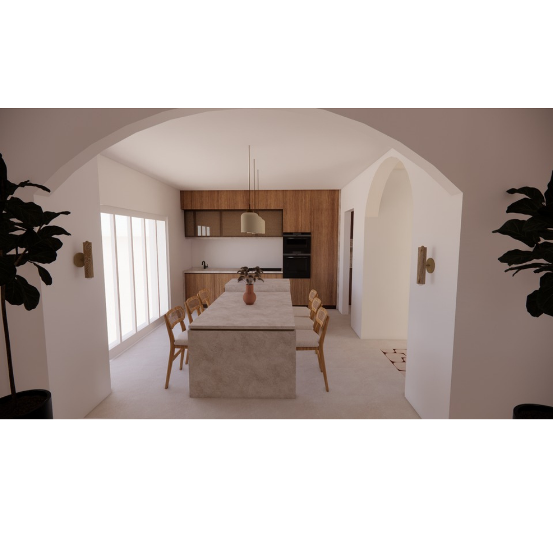 La pièce de vie principale est entièrement restructurée autour d’un espace ouvert et convivial. La cuisine contemporaine aux façades mates s’organise autour d’un îlot minéral central, pensé comme un véritable lieu de partage.